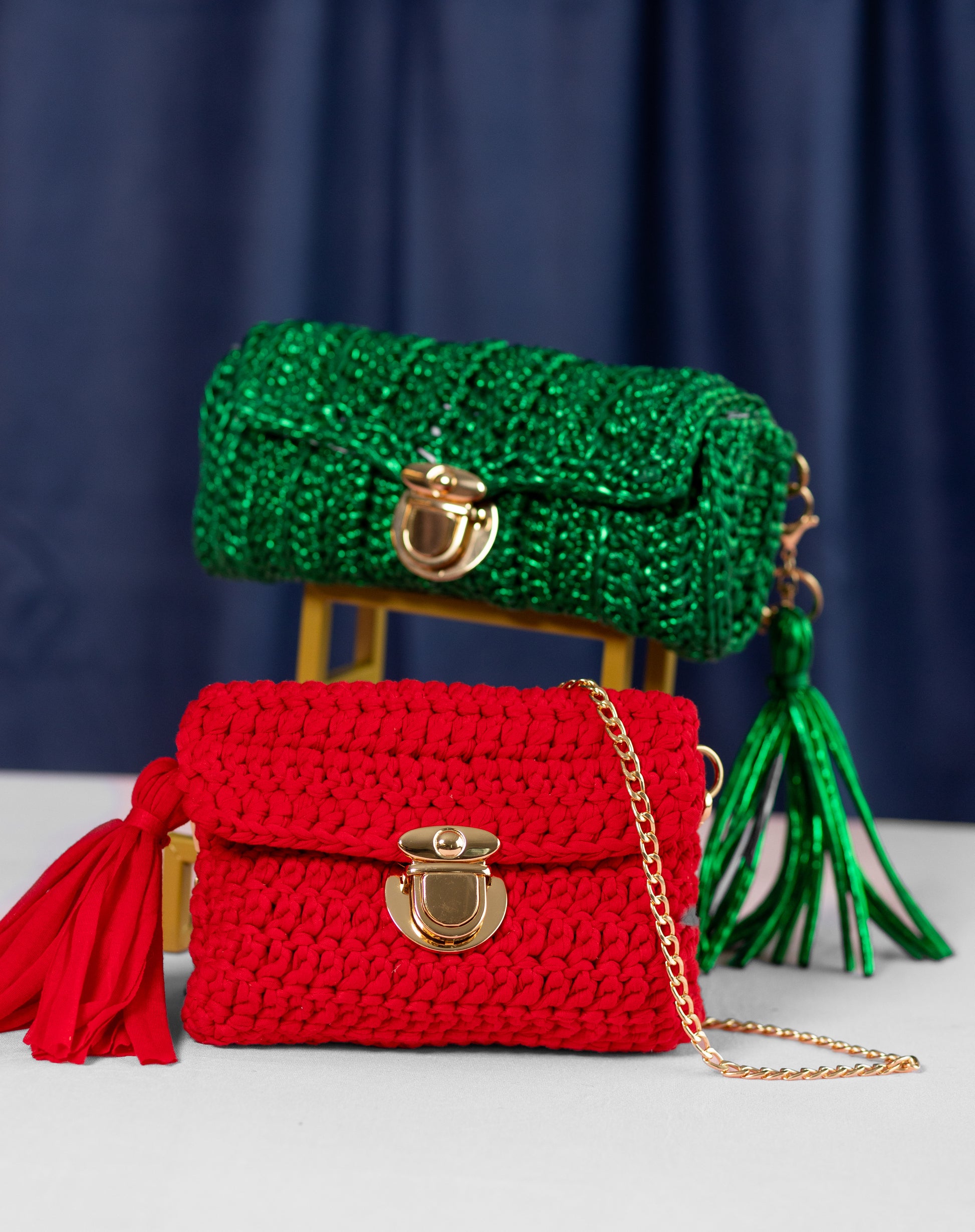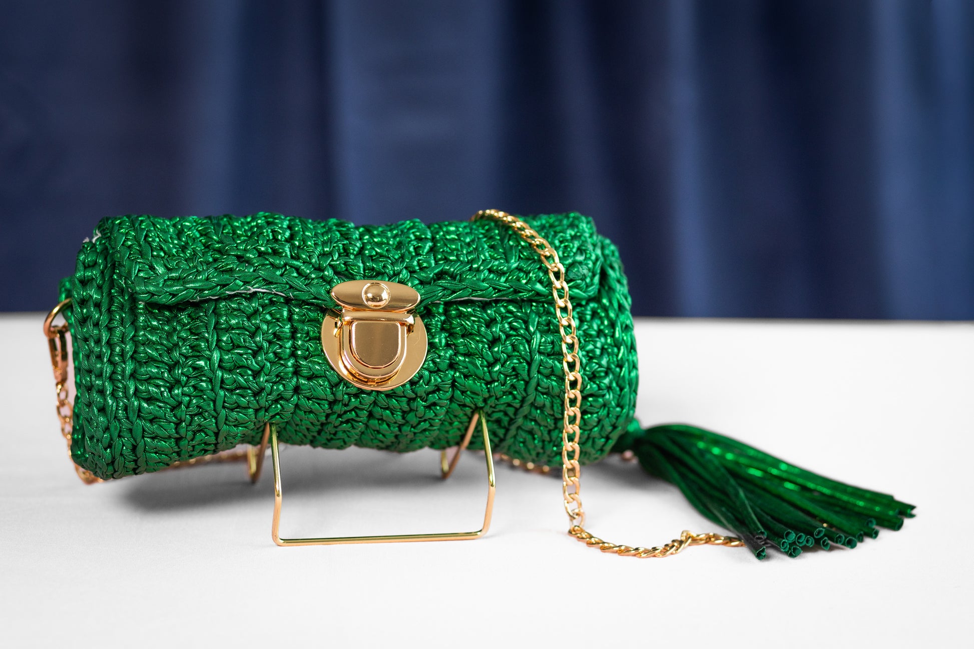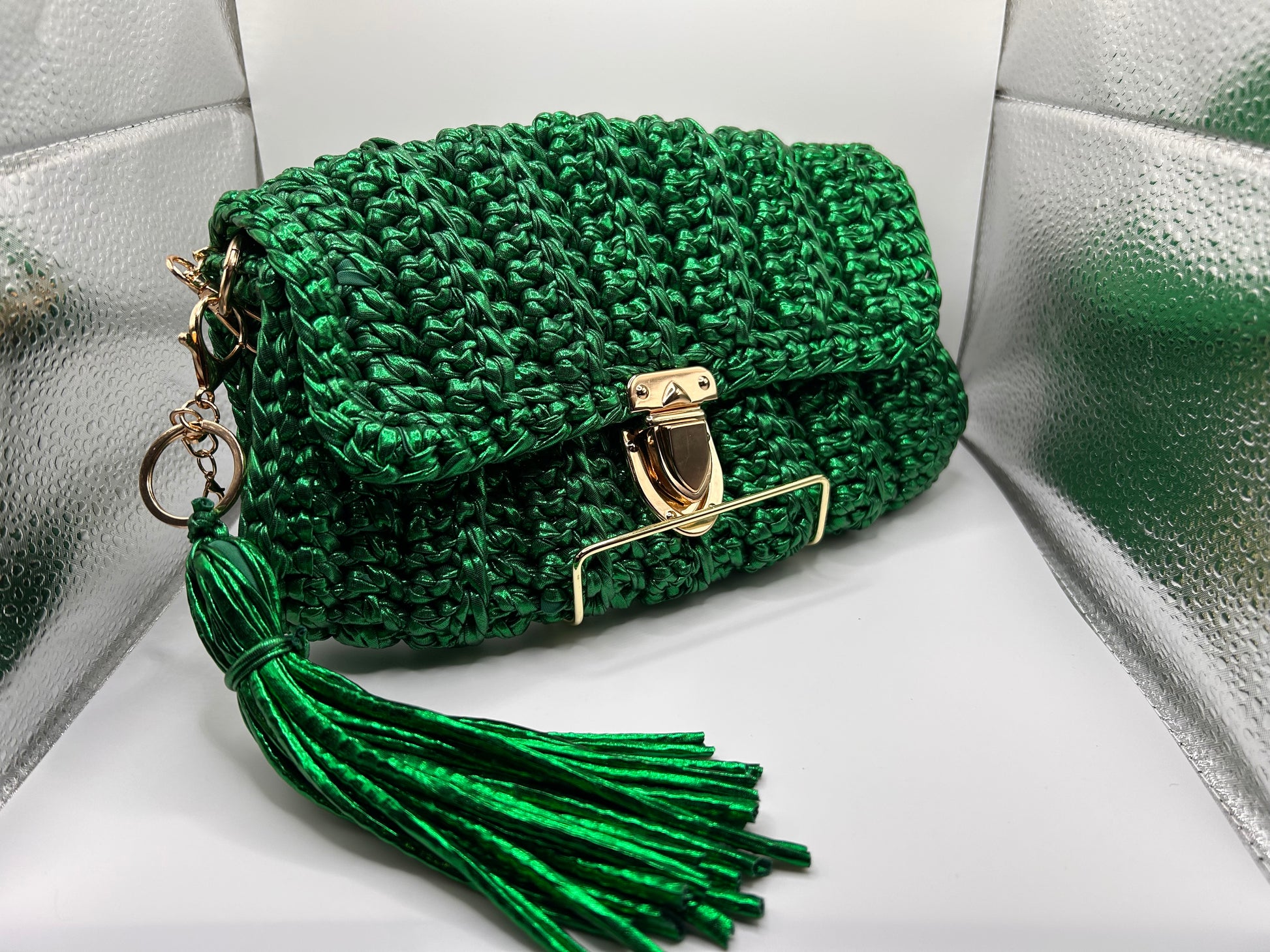 Green Metallic T-Shirt Yarn Clutch with a tassel on the side